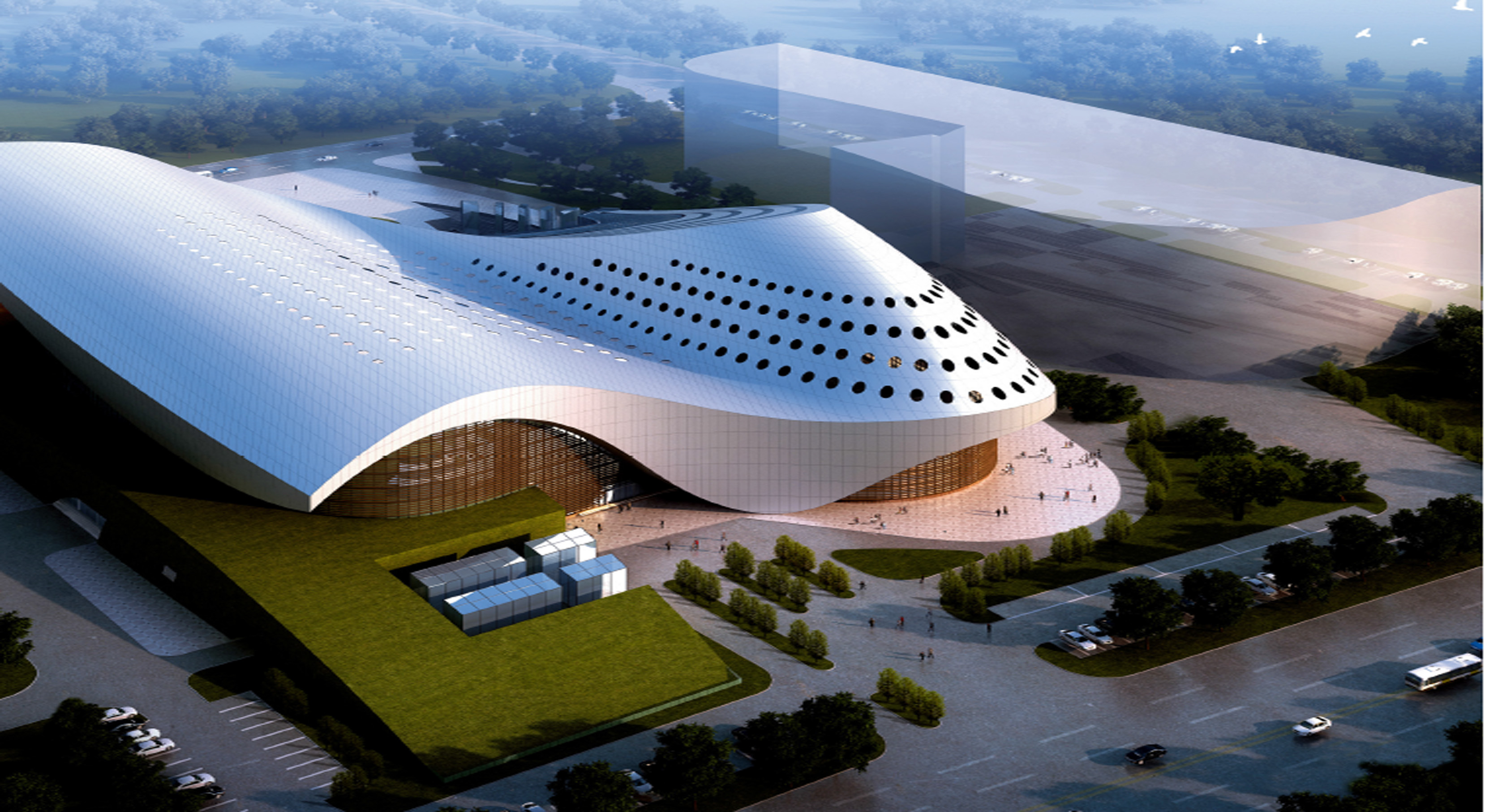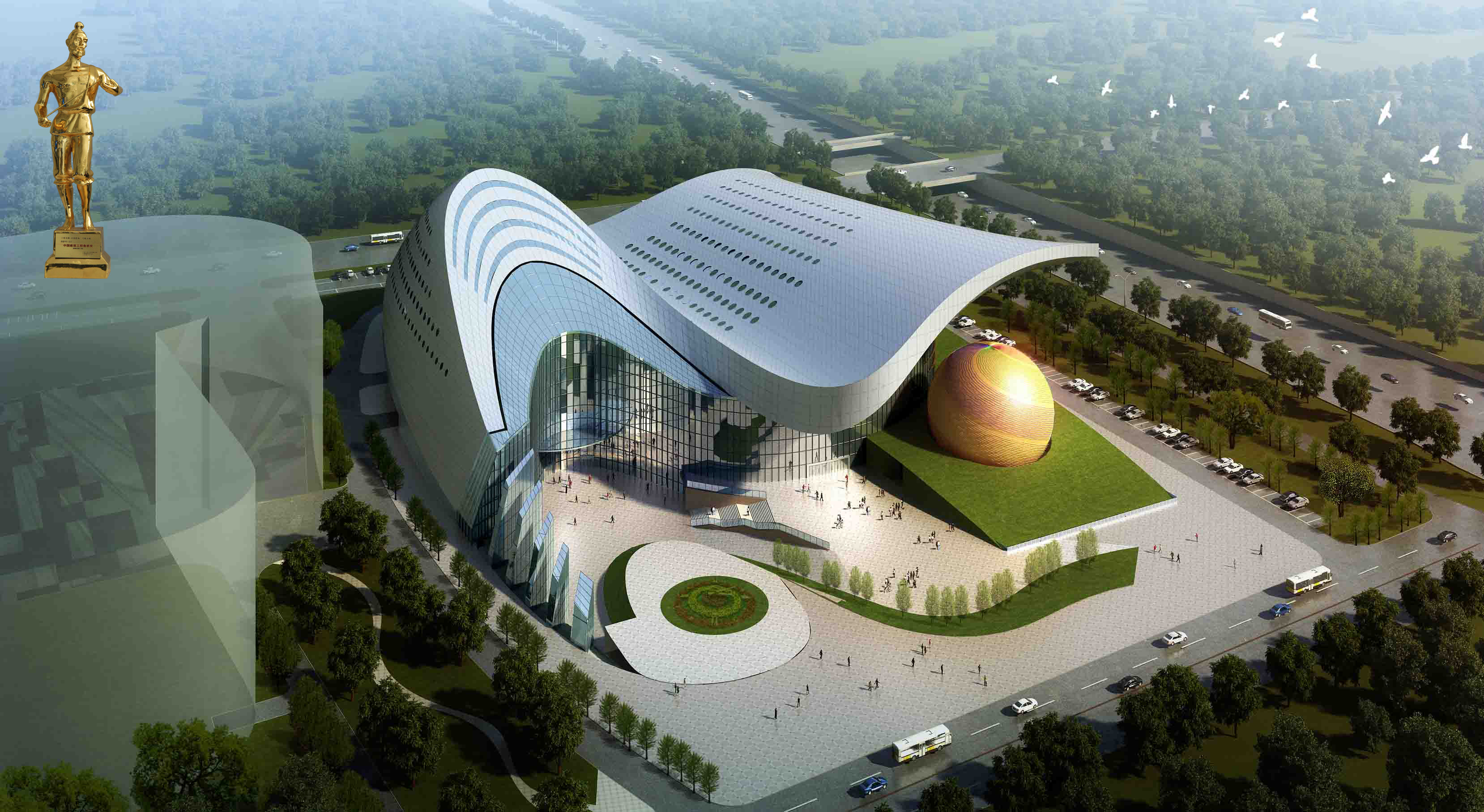 幕墻類型:埃特板、玻璃、全玻,屋面為鋁板、石材、穹幕幕墻